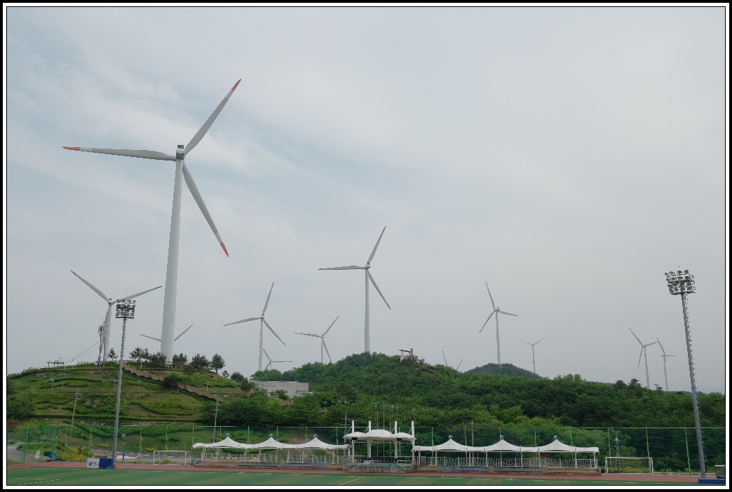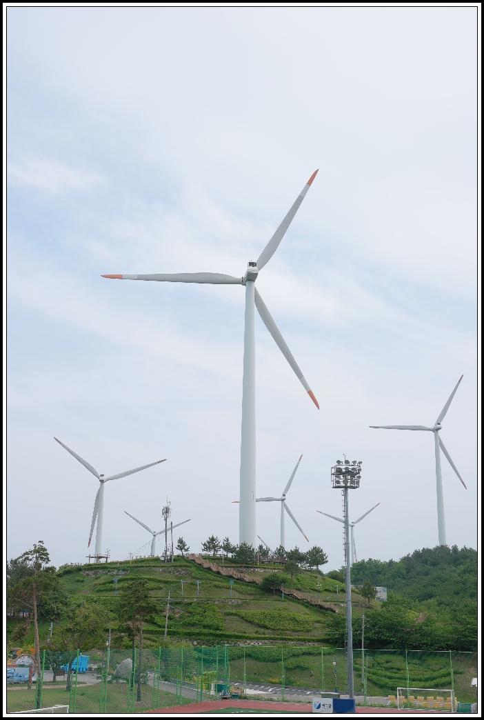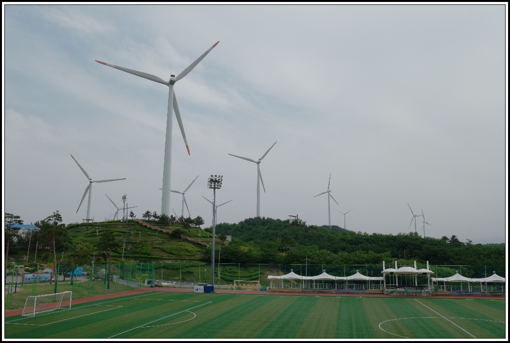 인조잔디 구장인 "해맞이 축구장"을 배경으로 서있는 풍력발전단지이며,