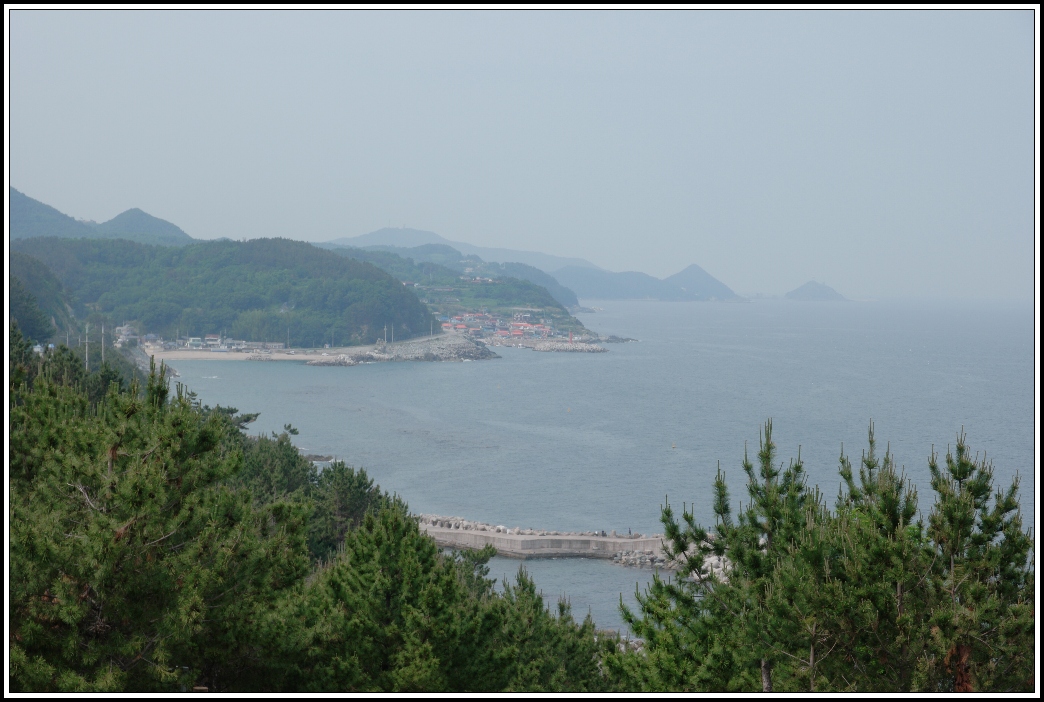 "오보 해수욕장"의 끝자락과 "노물항"의 전경이 들어오며,