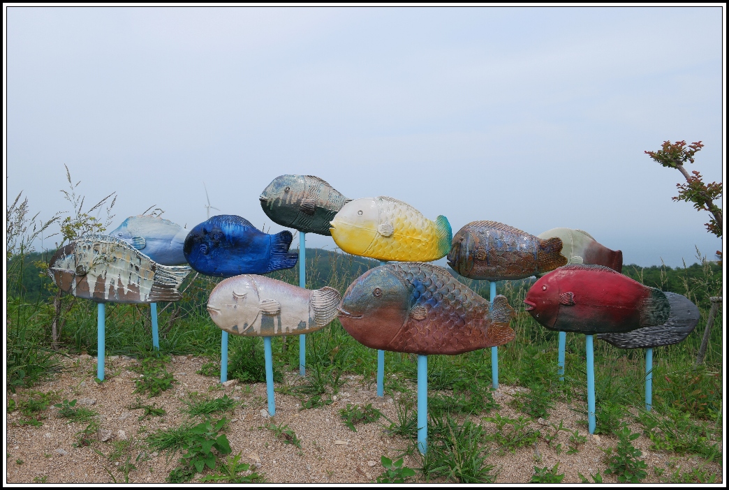 하나하나에 다양한 색상의 유약을 입힌 도자기로 조성된 물고기 모양의 조형물이 있어,