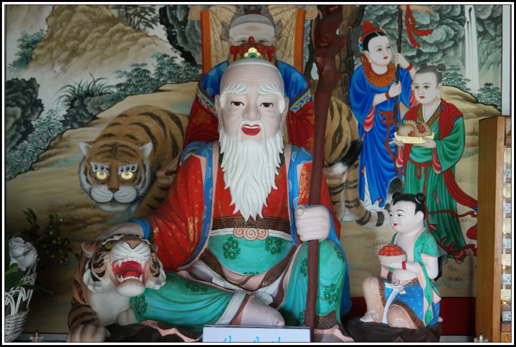 왼쪽에는 불교의 대승보살(大乘菩薩) 가운데 하나로 지혜를 완전히 갖춘 문수보살(文殊菩薩)로,