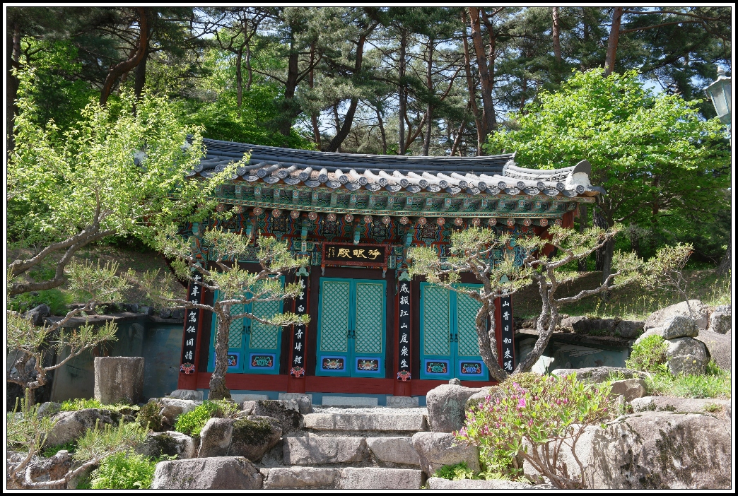 숲 앞에는 3칸의 맞배지붕의 전각인 정안전(淨眼殿)이 있어,