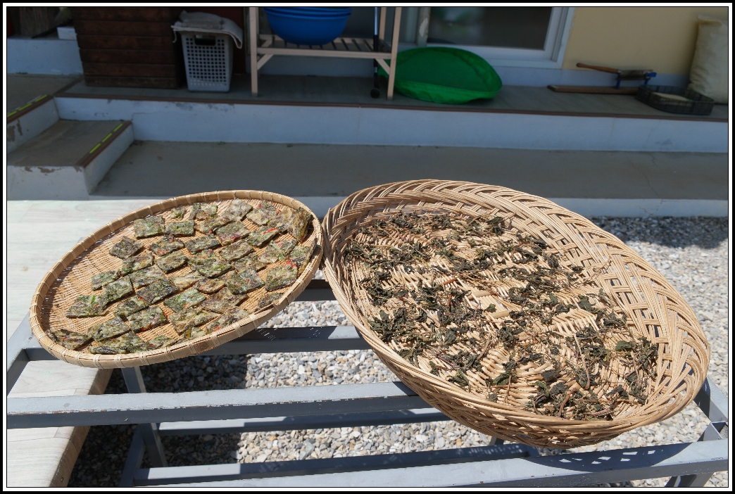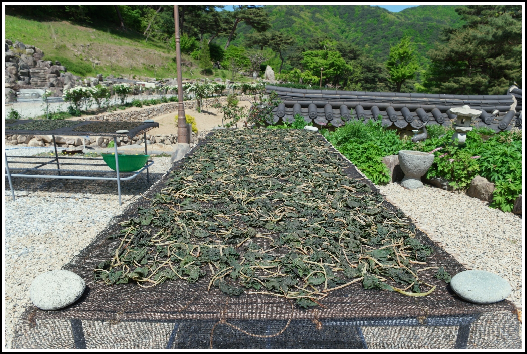 머위를 비롯한 여러가지 산나물 등을 발에다 말리고 있는데,