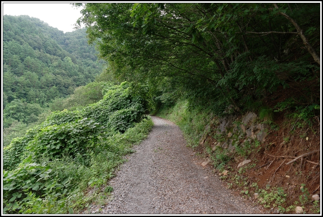 한여름에 초입부터 그늘도 없고 경사도 심한편인 시멘트 포장의 임도를,
