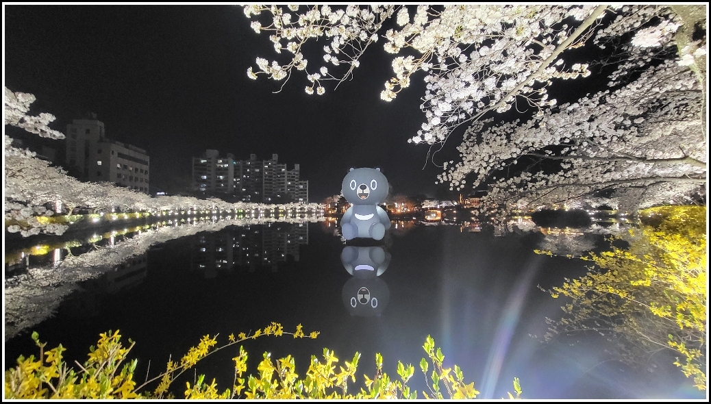잔잔한 물결 위에 비치는 벚꽃과 야경의 조화가 아름다운,